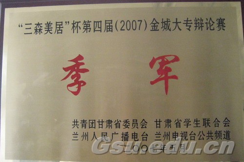 【本网讯】[记者马永良 通讯员张雯静] 备受全省关注的由共青团甘肃省委、甘肃省学生联合会、兰州人民广播电台和兰州电视台公共频道主办,以贯彻和落实科学发展观、积极构建社会主义和谐社会为主题的“ 三森美居 ”杯第四届(2007)金城大专辩论赛已于5月19日在省政府礼堂落下了帷幕,伟德代表队勇夺季军,为学校争得了荣誉,充分展示了伟德当代大学生的精神风貌和青春风采。