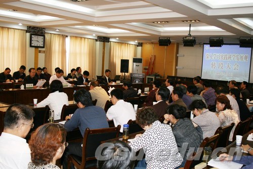 史校长指出:为保证调研工作落到实处,学习实践活动领导小组提出了具体的工作措施,明确了要求。一是广泛征求师生员工意见。设置了意见箱,发放征求意见表1000余份,收回923份,征求到对学校领导班子的意见91条,对各单位领导班子的意见133条,对这些意见和建议,学校认真加以梳理,提出了逐步整改的措施。二是精心设计调研课题。根据《关于切实做好调查研究工作的通知》,按照党委成员和机关、教学单位,共设立调研课题79项,这些课题的确定,为调研工作指明了方向,使调研工作能够做到有的放矢、切中要害。三是深入开展调查研究。学校和中层领导班子及党员领导干部按照已经确定的调研课题,紧紧围绕巩固升本成果、提高办学质量、提升办学层次、凝练特色、提升创新水平、建设和谐校园等方面深入开展了调查研究。四是即知即改。通过大家深入调研,无论从学校层面还是各单位、各部门层面,无论从宏观领域还是微观领域,我们都或多或少地发现了制约和影响学校科学发展的问题和不足,经过认真梳理,分别提出了改进的措施。