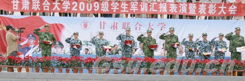 汇报表演结束后,史百战校长代表学校向承训单位赠送了锦旗,党委副书记汪建华同志宣读了《关于表彰2009级学生军训先进集体和先进个人的决定》,与会领导向获奖集体和个人颁发了获奖证书。