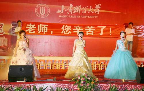 晚会在音符美妙的民乐《喜洋洋》、《茉莉花》、《花好月圆》联奏中拉开帷幕。男声独唱《西部情歌》节奏欢快、激情澎湃;表演唱《舟曲挺住》内容真实,演员神情投入,表达了学校师生对灾区学生的祝福和关爱之情;舞蹈表演《千手观音》、《爱的思念》舞姿婀娜, 全场掌声经久不息;男声独唱《等待》、《精忠报国》铿锵有力,饱含报国之情,唱响了整个校园,在场的同学都深深地沉浸在欢呼之中;女生三人组合唱《长大后我就成了你》歌声优美,表达了学生对老师的敬意之情和美好的祝福。