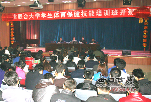 体育系主任陈毕栋就举办本期培训班的目的、意义作了开班典礼讲话,甘肃太昊职业培训学校莫兴邦校长分析了体育保健市场的前景和发展的方向,以培养保健人才的就业案例,并且就如何成为一名合格的体育保健师和如何在体育保健市场进行自主创业、对大学生实施国家职业技能鉴定等方面做了热情洋溢的发言;副校长郑伟强就大学生进行技能培训的重要性发表了讲话,他希望这次校企合作、开放办学能够长期、稳定的进行下去,同时希望参加培训班的学生提高认识,端正态度,珍惜机会,认真学习,掌握技能,为将来的发展奠定坚实的基础。