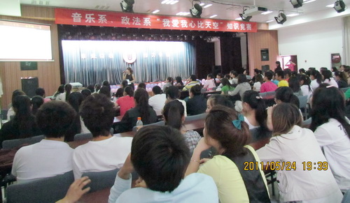 5月24日晚7:30,由政法系、音乐系承办的大学生心理健康知识竞赛活动在思源楼萃文厅举行。心理健康教育与咨询中心老师,各学院(系)心理助理,09、10级各班心理委员及其他院系近300名学生参加了此次活动。