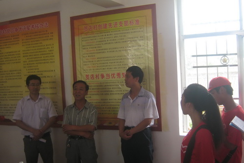 下午,在张老师的带领下,同学们前往了贺店村村委会与伏镇村村委会进行参观学习活动。在贺店村村支部张书记、伏镇村村支部杨书记的分别介绍下,同学们了解了贺店村与伏镇村的经济发展状况、人口、企业以及两村的发展规划。其中,伏镇村的“三个三”活动(即:“三到户”、“三到位”、“三评议”)和五德教育(美德、爱德、孝德、诚德、公德)更是体现了其强村富民之道。在座谈过程中,同学们了解到只有在全村上下形成人人了解活动、人人参与活动的良好氛围,才能真正实现组织创先进、党员受教育、群众得实惠。