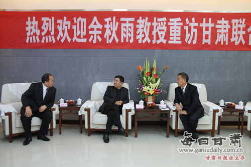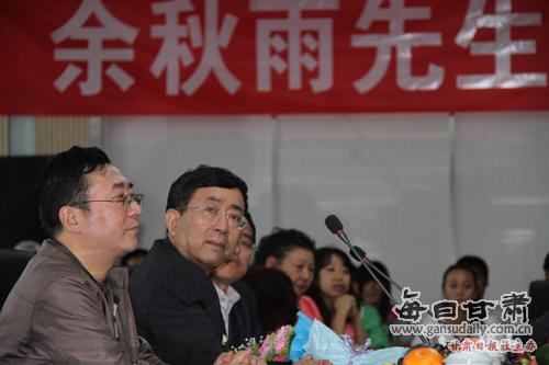 秋雨绵绵,丹桂飘香。2011年9月16日,国学大师、文化学者、散文作家余秋雨先生重返他阔别24载、曾经任教的甘肃联合大学。学校在安亭广场举行了热烈的欢迎仪式。校党委书记李志强,校长史百战,校党委副书记汪建华,副校长田建中,纪委书记杨扬,校长助理王克太、张焱,原校党委副书记宋耀禄,校友代表、当年戏剧创作专业学生史民(甘肃省话剧院副书记、副院长)、牟瑜(甘肃省歌剧院原副院长、艺术总监)、马强(甘肃省国家安全厅十处副处长)、张亚杰(省委宣传部舆情处副处长)及全校3000余名师生参加欢迎仪式。