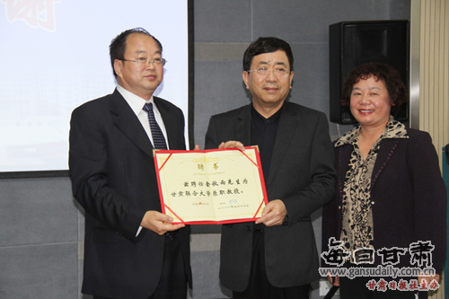 见面会上,史校长代表学校向余秋雨先生颁发了聘书,特聘他为甘肃联合大学兼职教授。