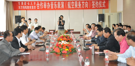2012年5月17日下午,甘肃联合大学、东方领航教育集团合作开办音乐表演专业(航空乘务方向)签约仪式在学校第一会议室隆重举行。校党委副书记汪建华,东方领航教育集团总裁戴晋权、院校合作发展部部长曾一君,甘肃省旅游局人事处处长陶银科,学校部分职能部门负责人及旅游学院全体教师出席了签约仪式。签约仪式由副校长田建中主持。甘肃日报、甘肃卫视、西部商报等媒体对签约仪式进行了报道。