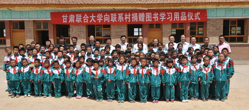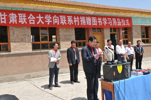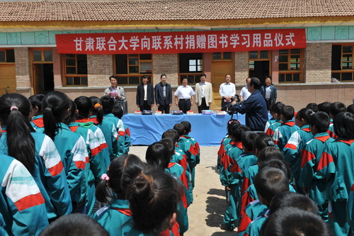 六一前夕,5月30日上午,甘肃联合大学向联系村小学捐赠图书和学习用品仪式在古浪县关爷庙小学举行。甘肃联合大学党委副书记汪建华、校长助理王克太,古浪县教育局副局长薛天祥,直滩乡党委书记仲乐堂、副乡长杨兴云,直滩乡中心学区区长王万生,老城村党支部书记贾彪,新城村党支部书记程体恒出席捐赠仪式,关爷庙小学全体师生、关庄小学师生代表,甘肃联合大学第八批50名入户干部参加捐赠仪式。捐赠仪式由中心学区区长王万生主持。