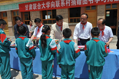 教育局薛局长致词表示,在双联行动中,甘肃联合大学发挥高校特长,更加关注学校,更加关注学生,在六一儿童节来临之际,向两所学校捐赠图书,向200多个学生捐赠书包、字典和学习用具,给学校师生很大鼓舞,对当地教育事业起到积极而深远的影响。