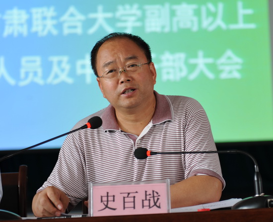 在中层干部会上,史校长首先传达了省委宣传部范鹏副部长7月11日调研讲话精神。范部长讲话中谈到三点感受:第一是联大给人以全新的印象。一是有厚重的历史;二是有后发优势;三是有历史机遇;四是有光明前景。第二是联大已经有很好的办学思路,有突出的办学特色。第三是在建设文化传媒大学方面联大认识到位、态度积极、思路开阔、实事求是。