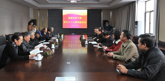 11月22日下午,离退休老干部学习十八精神座谈会在第一会议室举行,离退休老领导宋良智、康尔�、杨同书、张克让、谭发科、王启武、马志荣,党委书记李志强、校长史百战、副校长普登学出席座谈会,离退休党总支书记徐漓,校办、组织部、宣传部、人事处负责人参加座谈会,座谈会由党委书记李志强主持。