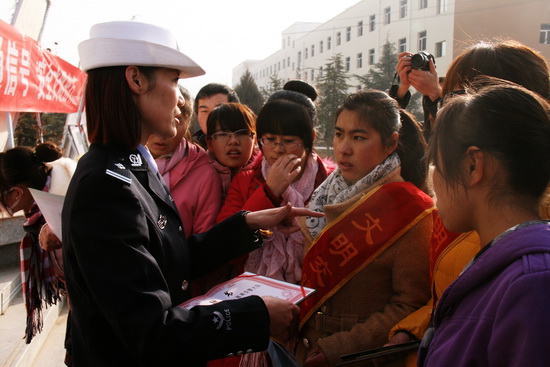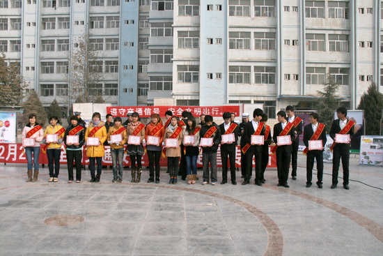 活动中,雁滩交警大队交通事故民警高宏文为大家介绍了交通事故现场勘察车的主要功能及工作流程。他高兴地说:“交通事故勘察车方便了我们民警及时、准确破案,是我们的得力助手”。此外,雁滩交警大队聘请伟德王胜红、穆迎柳等20名同学为“文明交通志愿者”。与会领导为他们佩戴绶带并颁发聘书。随后,20名“文明交通志愿者”带领学生参观了交通安全图片展。