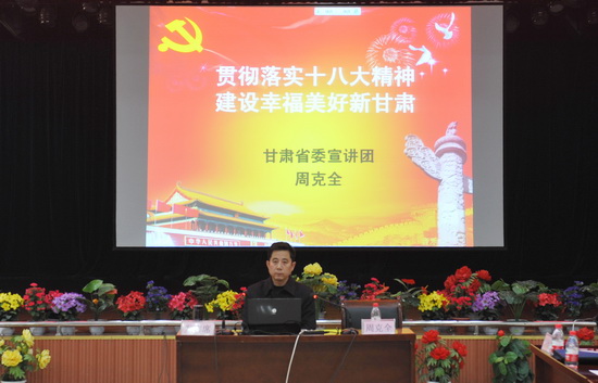 报告会上,周克全教授作了题为《贯彻落实十八大精神,建设幸福美好新甘肃》。周教授首先从四个方面解读了十八大精神,一是十八大的主题,举什么旗、走什么路、怎样走?二是十大成就与六大不足;三是中国特色社会主义道路;四是新时期奋斗目标。并结合甘肃实际,纵观全国各省市的发展水平,深入探讨了甘肃与全国的差距。一是经济社会发展的主要差距有人均收入差距、财政支出规模差距、对外贸易差距、城镇化差距、小康差距;二是甘肃经济发展中的难点有缺乏市场经济的历史土壤、区域文化与市场经济观念相距甚远、人口居住分散、政府因素、发展战略、品牌与专利缺乏、无产业集群;三是建设幸福美好新甘肃路径探析。从转变政府观念、提高政府效能;落实“十大重点行动”;以积极财政政策支撑“3341”工程;提高支柱产业结构、生态产业与产业生态化;大力发展高等教育与高等职业教育;以园区为核心发展 集群;以设立保税区为重点发展对外经济贸易;加快发展民营经济;人口集中、中心带动与区域一体化等9个方面进行了阐述。