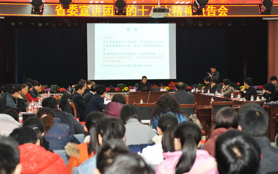 12月21日下午,在思源楼萃文厅伟德举行省委宣讲团党的十八大精神报告会。校院两级中心组专题学习党的十八大精神,校领导李志强、史百战、郑伟强、杨扬、普登学出席会议,校长助理王克太、张焱、漆增熙及校院中心组成员和全校副处级以上干部,教师、学生代表等300余人参加了会议。省委讲师团成员,甘肃行政学院决策咨询部主任、教授周克全做专题报告,会议由党委书记李志强主持。