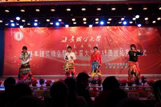 在颁奖晚会上,各社团表演的文艺节目精彩纷呈。开场歌舞《好日子》以欢快嘹亮的曲调、闪亮的灯光、喜庆的服饰使现场师生沉浸在新年欢乐的气氛中;二胡演奏《赛马》悦耳动听,清脆悠扬;诗歌《梦想社团、青春激昂》情感真挚,感人肺腑;“高原汉子”组合演唱的《欢乐的海洋、雪域火焰》激情澎湃,气场十足。晚会将迎新年活动推向高潮。