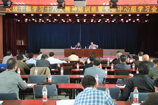 4月19日下午,学校处级干部学习贯彻十八大精神培训班暨党委中心组学习会在思源楼萃文厅举行。校领导史百战、汪建华、田建中、普登学,校长助理王克太、张焱、漆增熙出席学习会,校院两级中心组成员、全校副处级以上干部参加学习会。学习会由党委书记李志强主持。