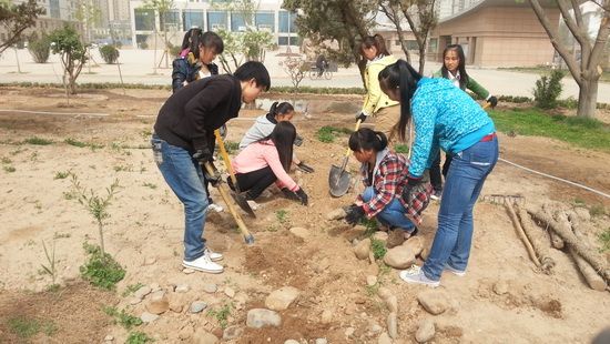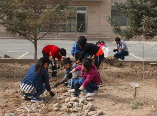 志愿者活动分为5个小组,各小组分工协作,大家拾捡垃圾、清理石子、铲除杂物、平整路面、修整花园,表现出极高的热情和良好的组织纪律性。在大家的共同努力下,经过近六个小时的奋战,完成共青林内四条石子路的铺设,草地、花台的垃圾清除;2号教学楼前清理石块、路面的平整,看到一条条凝聚了辛勤汗水的鹅卵石小路展现在眼前,志愿者们都露出了欣慰的笑容。