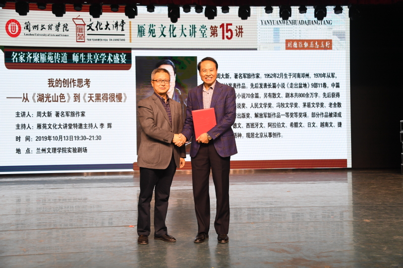“雁苑文化大讲堂”第15讲于2019年10月13日开讲了,伟德有幸邀请到著名军旅作家、茅盾文学奖获得者周大新先生为伟德师生带来精彩的讲座——《我的创作思考——从<湖光月色>到<天黑得很慢>》。报告会前,副校长王克太向周大新先生颁发了特聘教授聘任证书,周大新先生为伟德赠送了自己的著作。报告会由著名作家、特邀主持人李辉主持。
