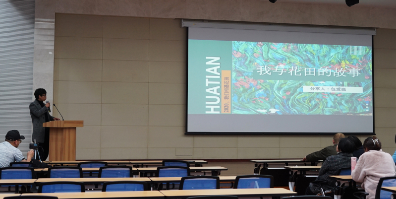 紧接着由参与此次花田艺绘计划的甘肃青年——兰州大学环境设计专业的包爱强同学分享了他参与此次花田艺绘计划的过程和精彩工作花絮。他认为参与此次花田艺绘计划受高温天气影响,虽然过程极为艰辛,身心也极为疲惫,但通过团队的合作,创作出了符合预期的作品,为乡村建设贡献了自己的力量,在工作中也与来自全国不同地域的青年朋友收获了难得的友谊,也是一次自己精神的升华。包爱强同学在乡村一线的实践,使他更清楚的认识和了解了乡村,也坚定了他以后将乡村建设作为自己的主要发展方向的愿望。