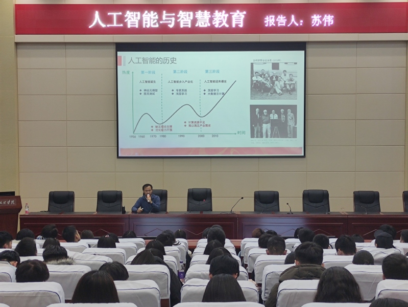 为进一步开拓学生们的学术视野,增加学生知识储备,同时加强我院对人工智能及大数据专业的建设,数字媒体学院于2020年12月11日晚邀请到兰州大学信息科学与工程学院副教授兼bv伟德国际1946数媒学院副院长苏伟,走进我院举办的《软工、大数据大讲坛》,为数字媒体学院大一、大二年级各专业学生代表200余人做了题为“人工智能与智慧教育”的学术报告,本场报告由数字媒体学院副院长黄珍主持。