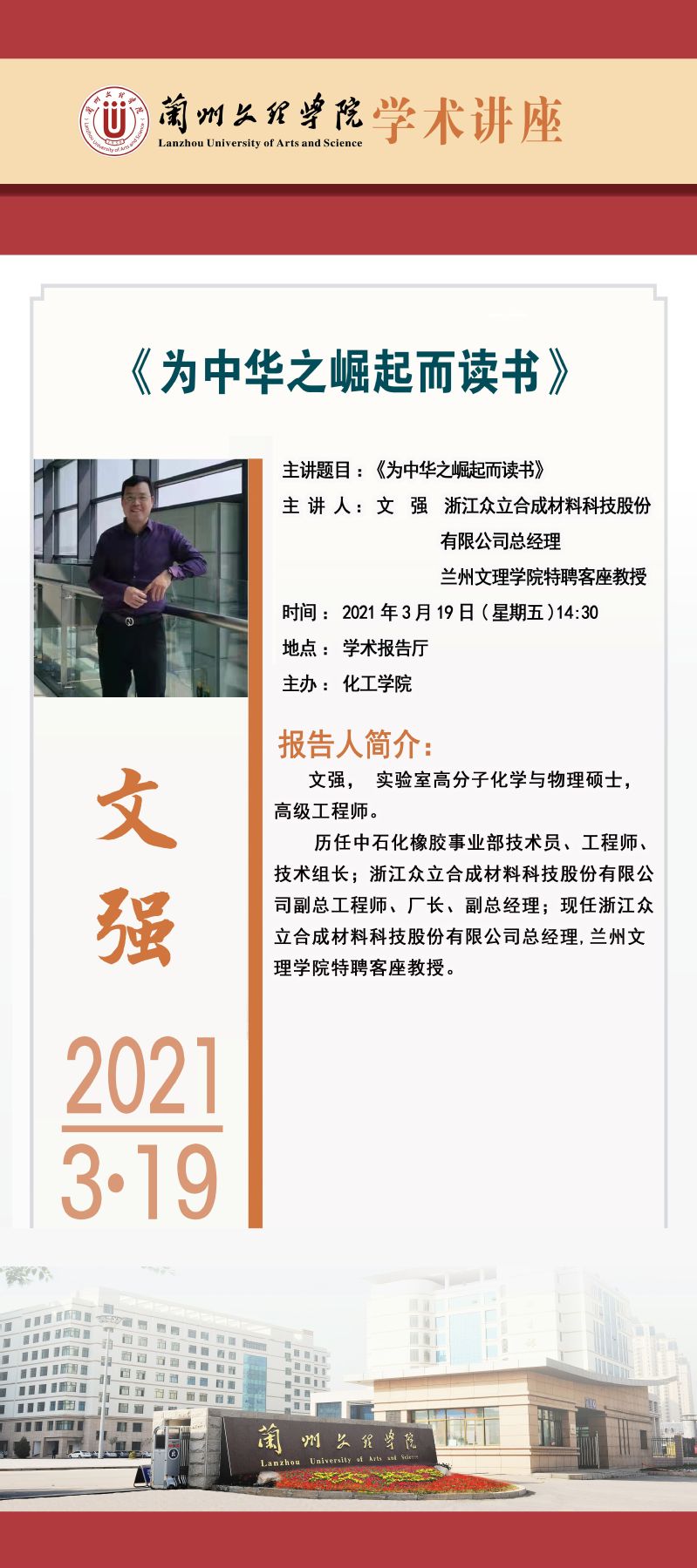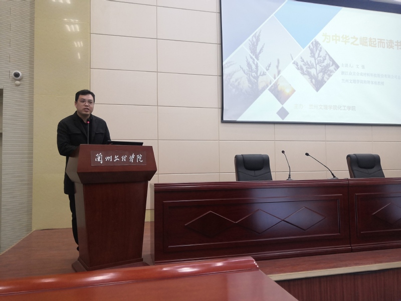 习近平总书记说过“只有把人生理想融入国家和民族的事业中,才能最终成就一番事业。”为了鼓励我院学子把握青年大好时光,奋斗青春,用自己勤劳的双手、一流的人生理想成就自己精彩的人生,化工学院于3月19日下午14时30分,在学术报告厅举办企业家进校园讲座之“为中华之崛起而读书”。学院邀请到浙江众立合成材料科技股份有限公司总经理、bv伟德国际1946特聘客座教授——文强先生主讲,化工学院院长张兴辉主持,学院2018级本专科学生200余人聆听了这场讲座。