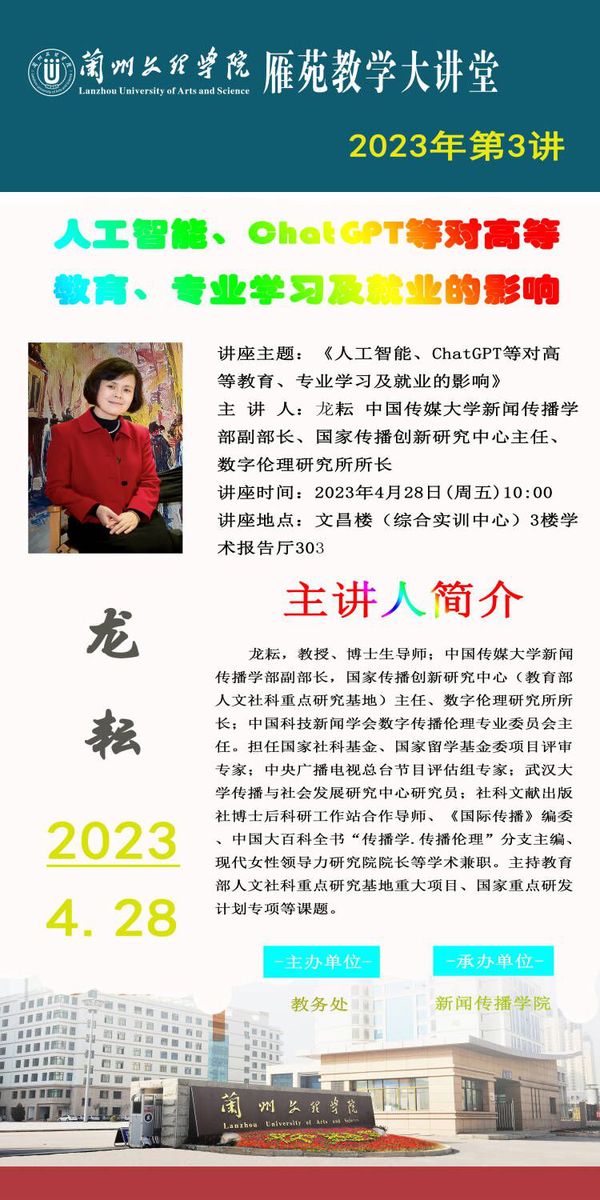 bv伟德国际1946雁苑教学大讲堂2023年第3讲——《人工智能 ChatGPT等对高等教育 专业学习及就业的影响》讲座通知