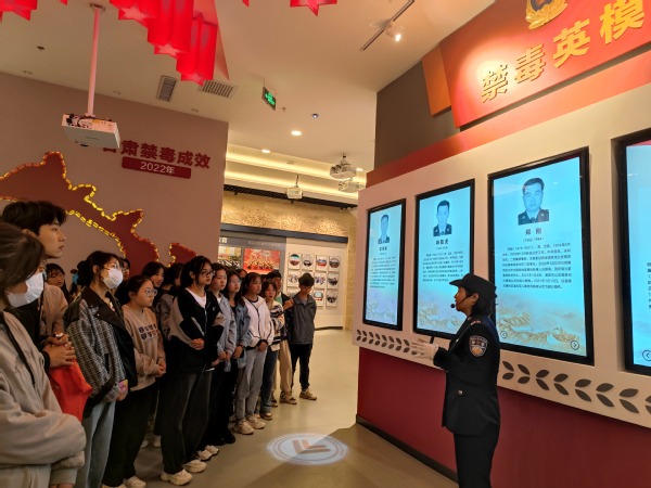 基地讲解员陈警官带领同学们观看了警示教育短片,了解娱乐场所形形色色的“毒品陷阱”,通过“是谁把药放在了你的饮料之中”等案例告诫同学们,娱乐场所的毒品接触只在一瞬之间,必须绷紧毒品防范这根弦。