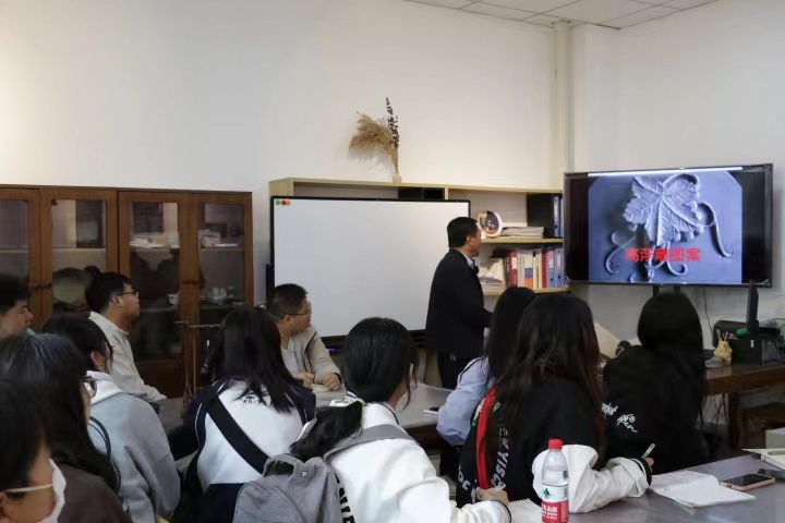 学生们走进洮砚雕刻技艺技能传承创新中心——王玉明工作室参观学习,王玉明老师从选料、设计、雕刻等入手详细介绍了洮砚制作工艺。洮砚所用原材料的产地为喇嘛崖水泉湾;洮砚的采石为人工开采运输;洮砚的制作分为选料、设计和雕刻三部分。其中选料是指从洮砚矿坑采回来的原石料进行挑选选出无杂质,无瑕疵,硬度均匀、泥质感强的原料;设计包括砚形设计和图案设计,同时给学生介绍了条形、扇子形、天然型等十二种砚形;雕刻包括线刻、阴刻、阳刻、浮雕、高浮雕五种基本方式。并通过纪录片的形式为学生们展示了一个完整砚台的制作过程。