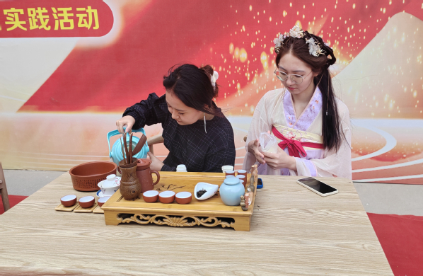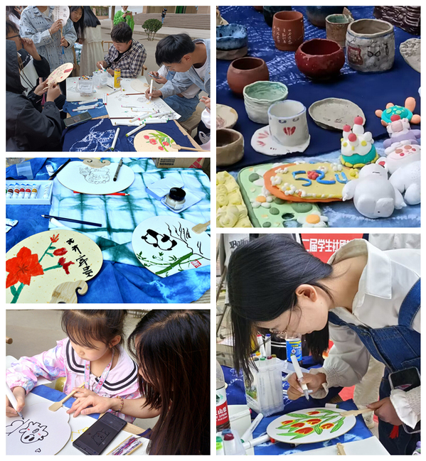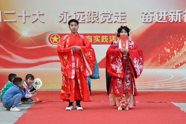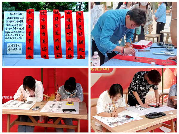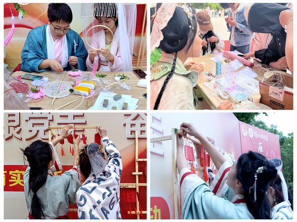 本次活动采用游园形式,集展示、游艺于一体。奕鸣美术协会的手工陶瓷古朴自然、意蕴天成,手绘扇面清新雅致、趣味盎然。博彧国学社社员们现场展示缠花、簪花和篆刻技艺,尽显中国传统工艺之美;“茶艺师”娴熟地温壶、冲泡、分茶、敬茶,吸引路过的同学驻足观看,品味茶香。书法协会组织的对对联活动准备了书签、小徽章作为奖品,吸引了众多同学参与。博彧国学社的汉服走秀和古代婚服礼仪展示压轴登场,伴随着主持人的讲解,身着宋裙、明制等各式汉服,头戴发簪、手持团扇的国学社社员款款走来,或色彩艳丽灵动飘逸,或修身适体简洁质朴,或端庄大气英姿飒爽,裙带飘扬,美轮美奂。同学们也从中了解了更多汉服文化与传统礼仪知识,领略了“衣冠上国、礼仪之邦”的魅力。