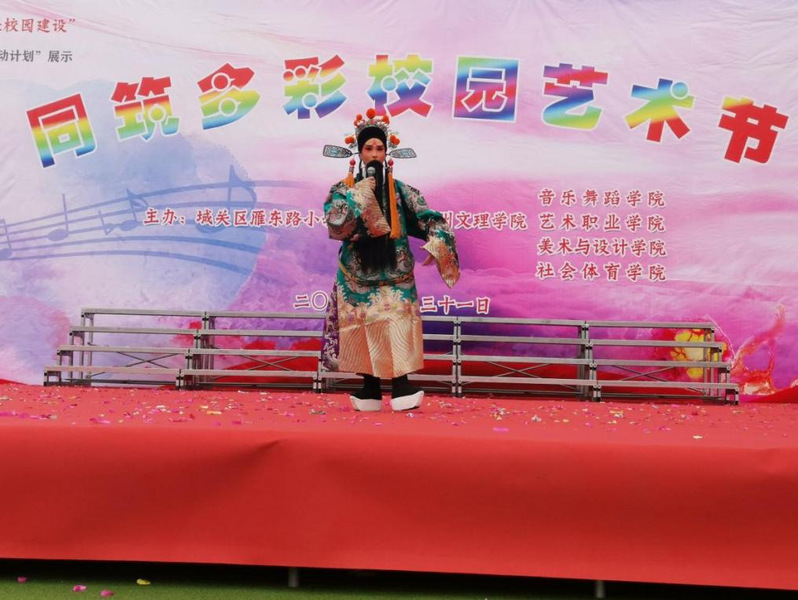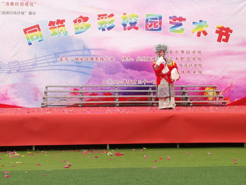 为进一步落实甘肃省教育厅“体育美育浸润行动计划”试点工作,推进新时代体育美育教育发展,为我省中小学体育美育均衡发展提供优质教育资源,引导师生强化服务社会意识,提升服务社会能力,以公益之心育人,发挥高校优势资源,5月31日上午,艺术职业学院(甘肃省艺术学校)戏曲专业学生参加了雁东路小学开展的“同筑多彩校园艺术节”活动。活动开始之前,雁东路小学选派少先队员为我院带队教师献上花束,对长期以来我院给予的支持帮助表示感谢。