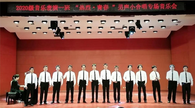为深入开展社会主义核心价值观教育,深化爱国主义、集体主义、社会主义教育,丰富校园文化活动,展现音乐舞蹈学院学生积极向上的精神风貌,倡导健康勤奋的学习方式,推动良好学风、优良班风建设,音乐舞蹈学院于6月8日晚在艺苑楼音乐厅成功举办了“热烈·青春”20级音表一班男声小合唱专场音乐会。