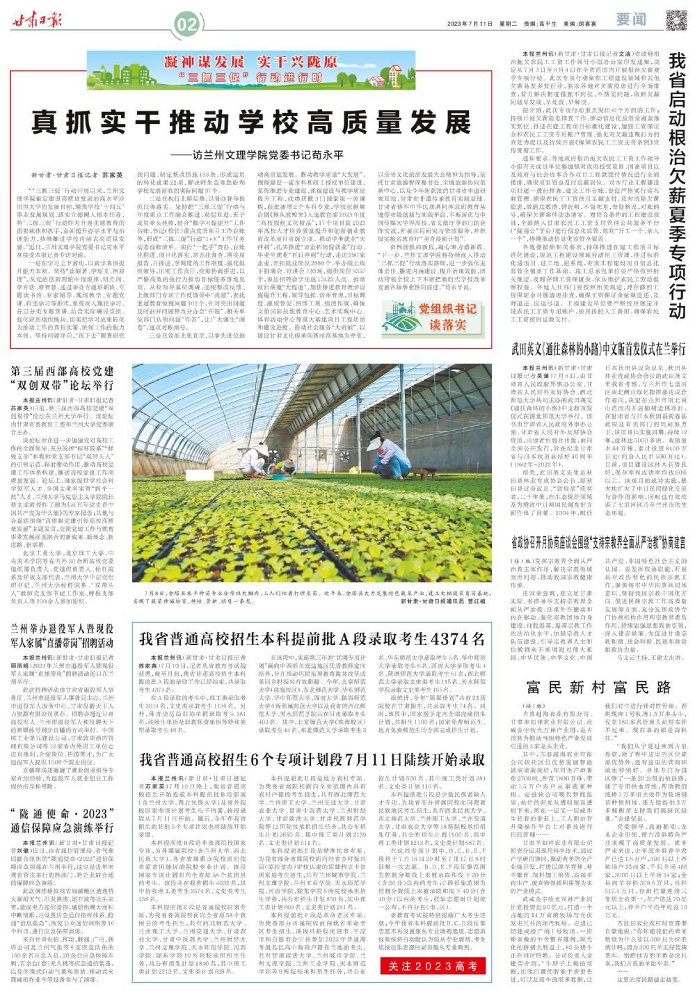 三是在效能上见真章,以争先进位推动高质量发展。推动教学质量“大发展”,围绕建设一流本科和硕士授权单位建设,系统推进专业建设、课程建设与教学质量提升工程,成功获批3门国家级一流课程,获批新增2个本科专业;学校原创舞台剧《舞从敦煌来》入选教育部2023年度“高校原创文化精品”;17个项目获2023年高校人才培养质量提升和创新创业教育改革项目省级立项。推动学生就业“大冲刺”,扎实推进“访企拓岗促就业”行动、毕业生就业“百日冲刺”行动,走访290家企业、开拓就业岗位2880个,举办线上线下招聘会、宣讲会120场,提供岗位8357个,参加招聘会学生达13423人次。推动项目落地“大提速”,加快推进教育教学设施提升工程,领导包抓、清单管理,目标调度、跟踪督促,倒排工期、挂图作战,确保文旅国际技能教育中心、艺术实践中心、体育活动中心等重大基建项目工程质量和建设进度。推动社会服务“大贡献”,以建设甘肃文化传承创新示范基地为牵引,以全省文化旅游发展大会精神为指导,依托甘肃旅游智库秘书处、全域旅游协同创新中心,以及今年新获批的甘肃省非遗研究基地、甘肃省非遗传承教育实践基地、甘肃省铸牢中华民族共同体意识教育基地等省级创新与实践平台,不断深化与中国传媒大学等高校、省文旅厅等部门的合作交流,开展应用研究与资政服务,并积极实施省教育厅“美育浸润计划”。