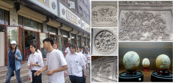在指导老师的带领下,团队成员参观了八坊十三巷。徜徉在这悠长又静谧的巷子里,特色砖雕融入到民居建筑中,让团队成员感受到了非物质文化遗产对旅游事业和乡村整体发展的重要性。在精美绝伦的蛋雕等艺术品中,大家深刻体会到非遗传承人的高超技艺和创造性思维,被这种方寸之中造就河山的艺术所折服。
