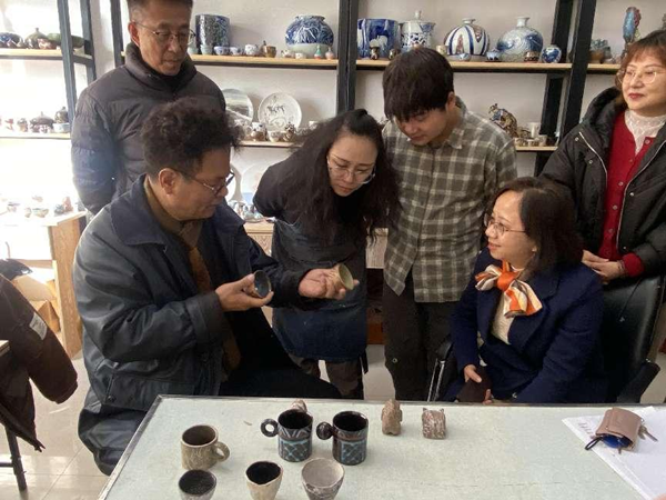 林家阳一行先后走访了陶艺工作室与学院展厅,认真观看了师生作品,对老师和学生在设计创作过程中的钻研与创新精神给予了肯定。同时,从文创产品的艺术造型、创意提升、产品推广等方面做了细致入微的指导,使大家受益匪浅。
