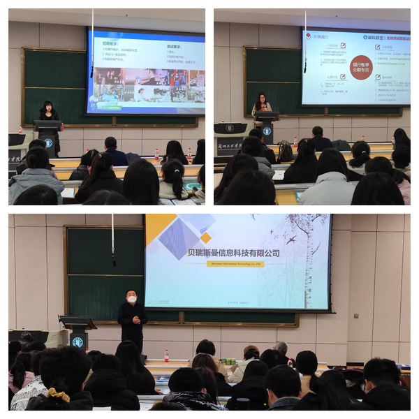 本次宣讲会邀请了上海链家房地产经纪有限公司、苏州贝瑞斯曼信息科技有限公司和西安迪科数金智能科技有限公司。三家公司的招聘负责人依次进行了招聘宣讲,从公司简介、办公环境、薪酬福利以及岗位需求四个方面为同学们做了详细介绍。