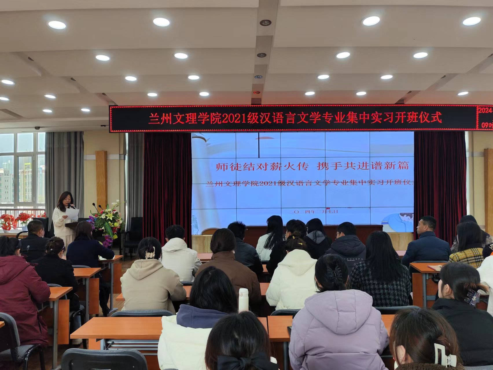 3月7日,文学院组织2021级汉语言文学专业学生赴兰州市城关区华侨实验学校开展为期一学期的教育实习工作。华侨实验学校热情接待师生一行,并举行入校实习启动仪式暨实习生与指导教师结对见面会,双方就学生实习、就业的相关事宜进行交流座谈。
