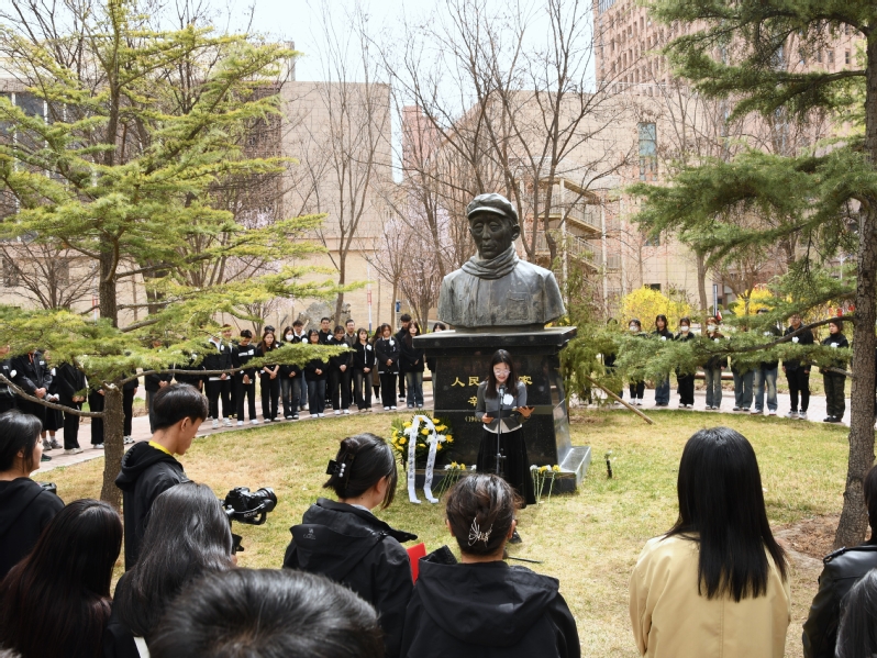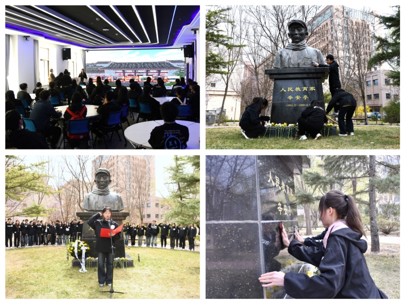 4月3日,在清明节到来之际,校院两级学生会工作人员和学生社团骨干,共同开展“缅怀安亭先生 传承校训精神”清明祭英烈主题活动。同学们认真清洁校园里的每一处辛安亭铜像。宁静的校园里,师生们肃立在人民教育家辛安亭先生铜像面前齐唱国歌,向辛安亭先生铜像敬献花篮和亲手制作的小白花,鞠躬悼念,默哀沉思。第十期“青马工程”优秀学员李佳欣同学带领大家重温入团誓词,这是传承先辈意志、勇担时代使命的铿锵誓言。习近平新时代中国特色社会主义思想青年学习社社员常楠作了“缅怀安亭先生 传承校训精神”主题微宣讲,讲述了辛安亭校长一生坚守初心使命,躬耕人民教育的感人事迹,号召同学们守好“红色根脉”,传承“明德强能、励志笃行”校训精神。