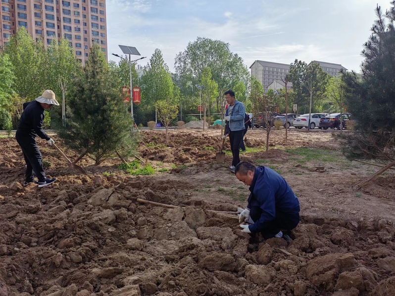 劳动中,大家顶着烈日,分工协作,有的用铁锨翻地、有的捡石头、有的运送垃圾,参加劳动的党员、职工们发扬不怕苦、不怕累的精神,劳动劲头极高。在大家的共同努力下,西大门花园种植花草的土壤得到改良,用实际行动践行党员的初心和使命。