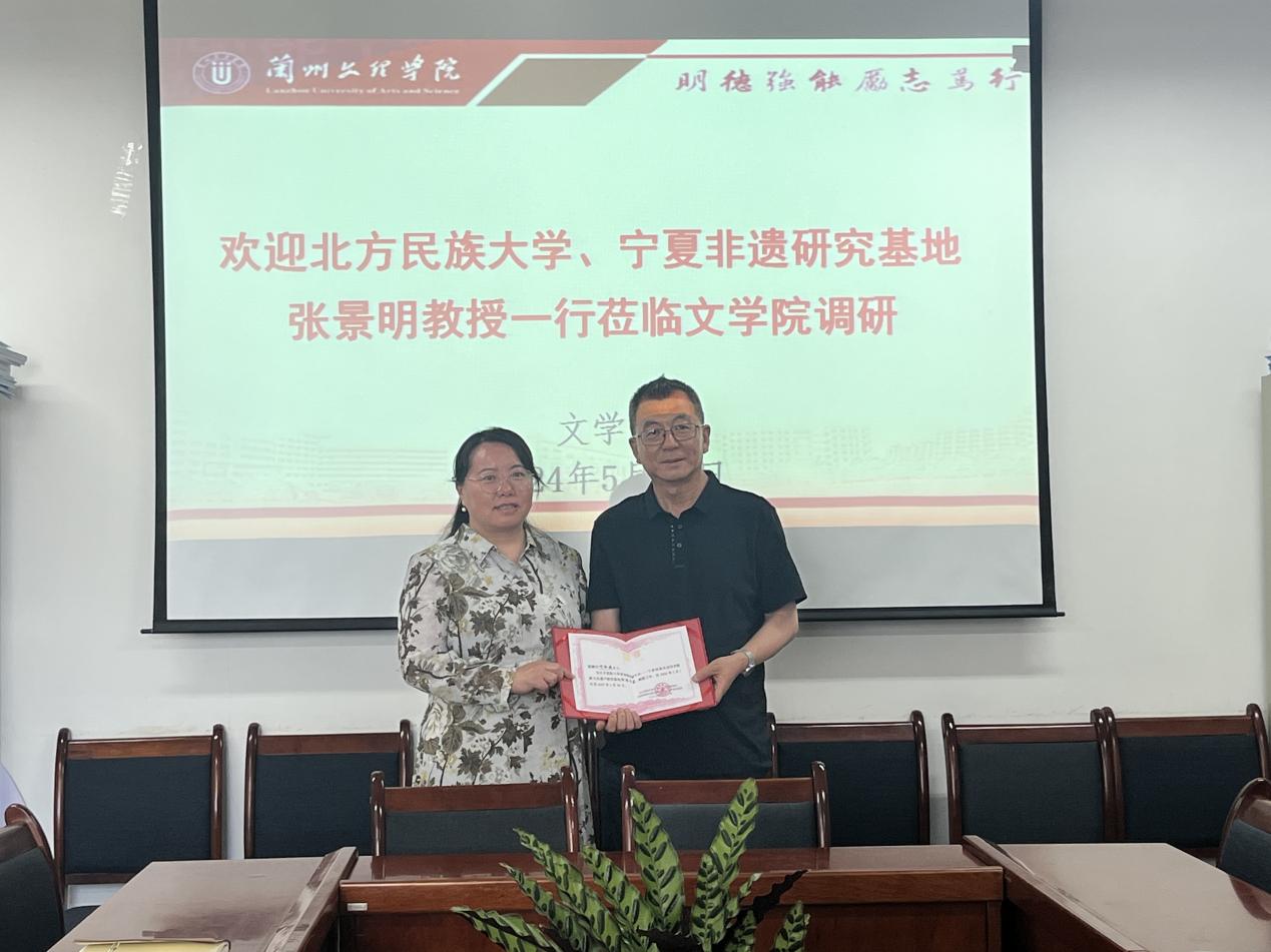 座谈会上,张景明介绍了宁夏自治区非遗研究基地开展的非遗研究和培训工作,以及基地建设成果等情况。并向文学院院长叶淑媛颁发了北方民族大学省部级科研平台——宁夏回族自治州非物质文化遗产研究基地特聘专家证书。