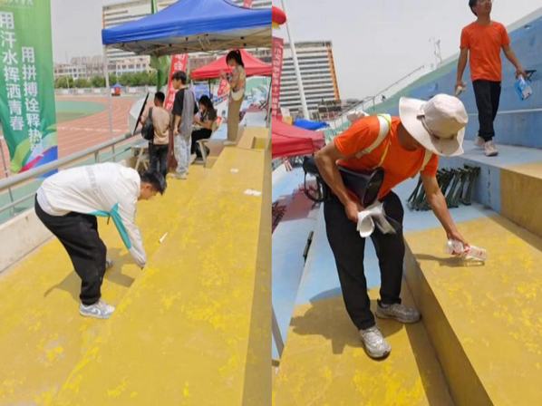 在比赛日的首个上午赛事结束后,学校第一运动场看台遗留了大量垃圾,包括纸巾、纸板及饮料水瓶等。面对此景,学院辅导员立即组织团学干部对看台进行了全面而细致的清扫工作。尽管天气炎热,但同学们毫无怨言,他们不怕脏、不怕累,相互协作,经过近四十分钟的努力,将看台垃圾清扫干净。