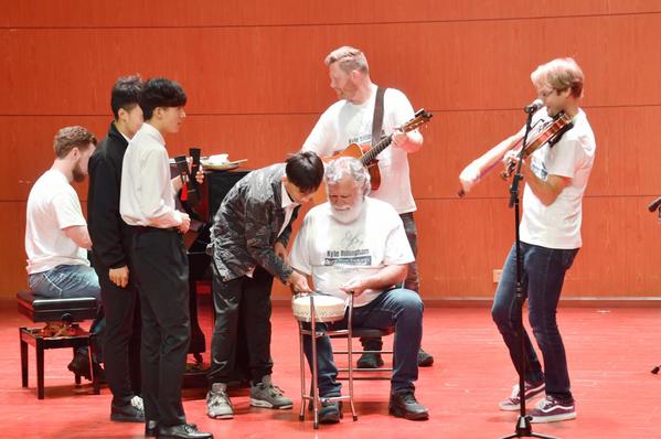 艺术交流活动上,伟德师生表演了民族室内乐《敦煌新语》、琵琶中阮合奏《送我一只玫瑰花》等精彩节目,“马掌路”乐队为伟德师生演奏了原创美国西部乡村音乐曲目及观众耳熟能详的中国经典乐曲,领队凯尔·迪灵汉姆还与伟德教师李文浩合奏了经典二胡曲目《赛马》,乐队精湛的演出技艺和激情四射的舞台表演,赢得了现场师生热烈的掌声和喝彩。