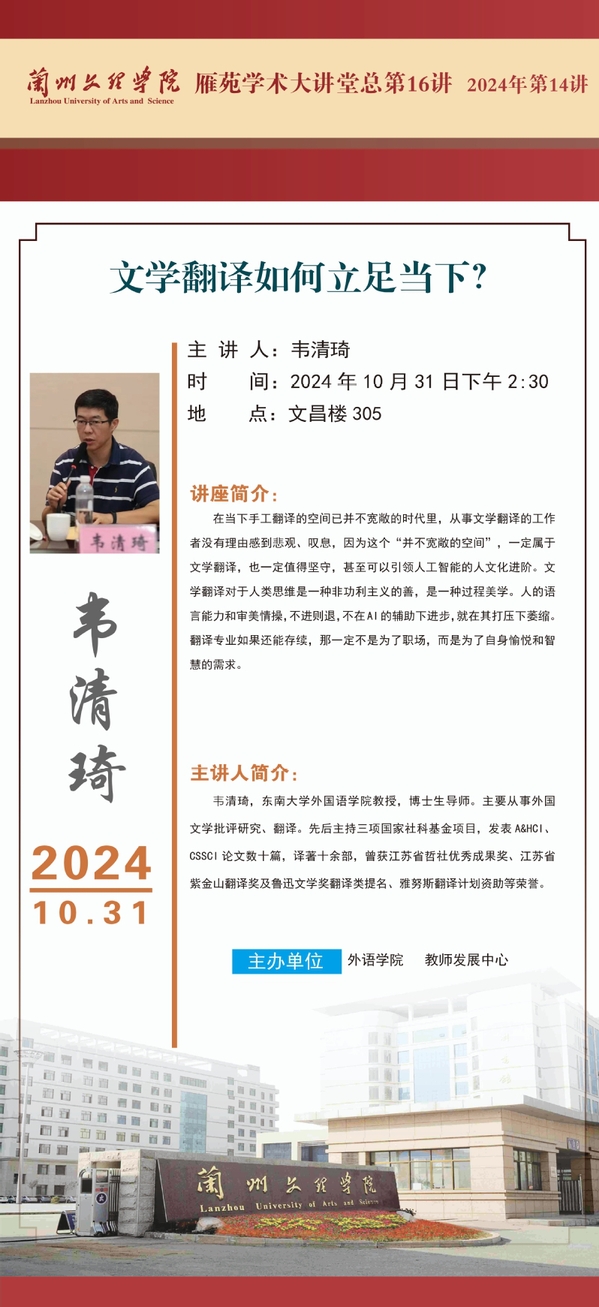 雁苑学术大讲堂《文学翻译如何立足当下》讲座预告(总第16讲 2024年第14讲)