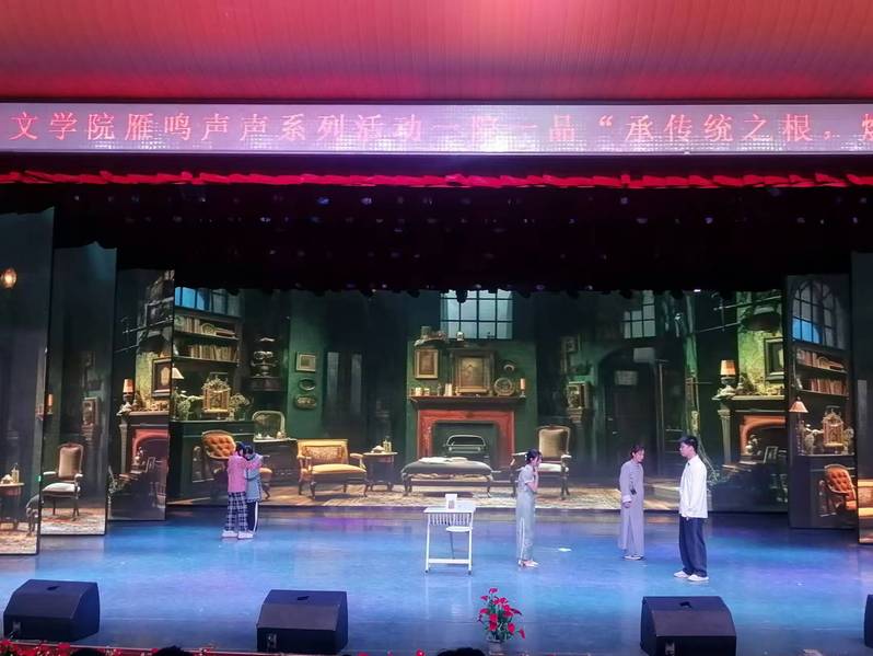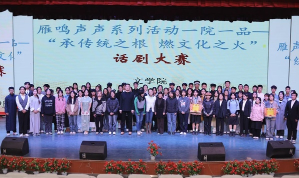 11月20日晚,文学院举办了“雁鸣声声”系列活动之一院一品——“承传统之根,燃文化之火”话剧大赛。本次大赛以话剧为载体,生动再现诸多历史事件与经典故事,旨在传承与弘扬优秀传统文化,激发同学们的爱国情怀。