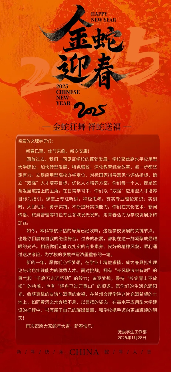 新的一年,愿你们心怀梦想,在学业上精益求精,成为兼具扎实理论与出色实践能力的优秀人才。面对挑战,拥有“长风破浪会有时”的勇气和“千磨万击还坚劲”的毅力;追逐梦想,秉持“咬定青山不放松”的执着,也有“轻舟已过万重山”的顺遂。愿你们的生活充满阳光,收获真挚的友谊与满满的幸福,在bv伟德国际1946这片充满希望的土地上,如同黄河之水奔腾不息,以昂扬的姿态,在高水平应用型大学建设的征程中,书写属于自己的璀璨篇章,和学校携手迈向更加辉煌的明天!