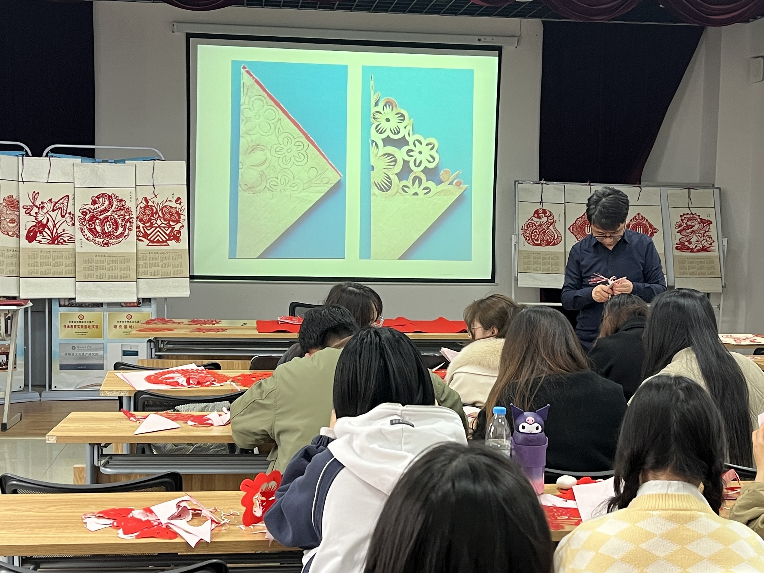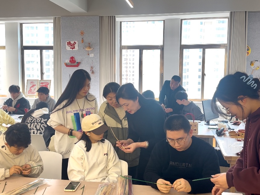 草编课上任新芳现场演示传统草编工艺,她将"挑压编"、"缠绕编"等核心手法逐一拆解,指导学生学习制作草编三角形编法。剪纸课堂上裴天鹏指导学生运用“折、画、剪”等技法进行剪纸创作。实践课结束后学生们表示收获良多,希望继续学习更多相关技艺。