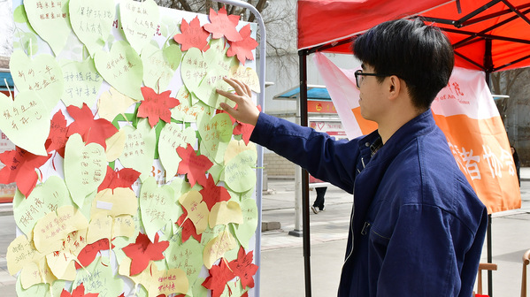 同学们以植树拓印签到,用五彩画笔在展板上留下专属印记,仪式感满满。“树木谜语我知道”环节,同学们穿梭于树木间,寻找谜题、积极作答,兑换“绿色能量包”,现场气氛热烈。“植树盲盒我来猜”同样吸睛,参与者抽取盲盒,回答树木特征、名称或环保知识相关问题,在趣味中增进对树木与环保的了解。在“我和小树有个约定”环节,同学们在心愿卡上写下环保目标,许下绿色约定,温馨且动人。