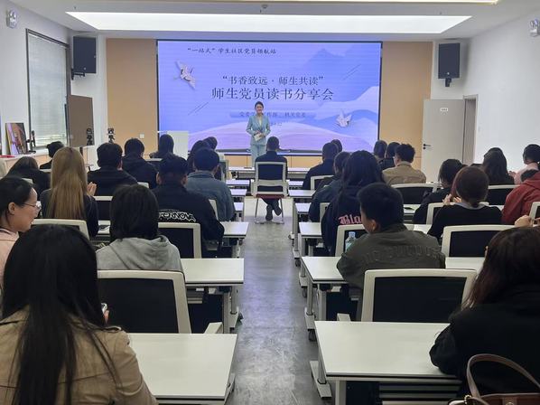 活动以师生共读、交流感悟的形式展开。来自一站式学生社区公寓党员领航站的10名学生党员代表依次分享了《天堂旅行团》《钢铁是怎样炼成的》《平凡的世界》等经典著作的阅读体会。同学们结合自身成长经历,从不同角度阐释了经典作品的精神内涵,为在场师生特别是考研学子提供了宝贵的精神指引。8名一站式学生社区党员领航员、机关青年党员教师立足工作实际,分享了《你当像鸟飞往你的山》《苏菲的世界》等著作的阅读感悟,内容涵盖奋斗精神培育、心理健康教育等多个方面。新闻与传播学院23级播音主持艺术班同学带来的诗朗诵《旗帜》将活动推向高潮,现场书香氛围浓厚。