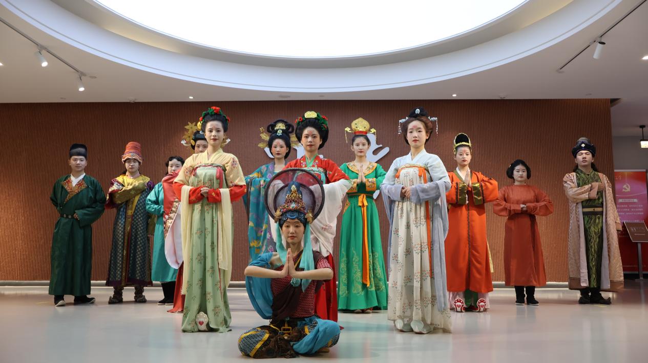 活动现场,文学院学生参与了敦煌服饰秀活动,他们身着14套不同历史时期的敦煌服饰惊艳亮相,展现了从魏晋到隋唐的千年文化变迁。这些服饰的色彩、纹样、制式均复刻自莫高窟的经典洞窟,石青、赭红、鎏金等传统色彩的交织,将敦煌古韵完美呈现。随着古乐声起,学生们化身“文化使者”,以灵动的肢体语言,带领观众穿越时空领略敦煌艺术韵味。