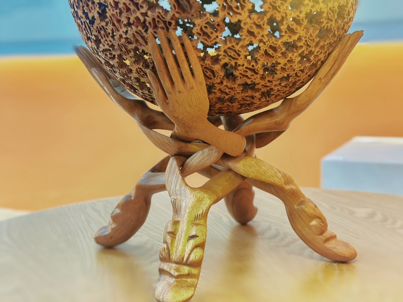 《手托乾坤》为野生山核桃工艺佳作。该作品以山核桃切片为材,创作者巧妙借助山核桃天然纹理,拼合出象征乾坤宇宙的圆球。圆球以中心四瓣核桃为视觉核心,依托天然纹路向外辐射,似蕴含阴阳变幻与世间万象。下方底座以木刻套雕双手稳稳托起圆球,手部形象线条流畅、雕工细腻。这一设计不仅增添了作品的观赏性,更寓意人类以智慧和力量承托天地、顺应自然,传递出和谐共生的美好愿景。