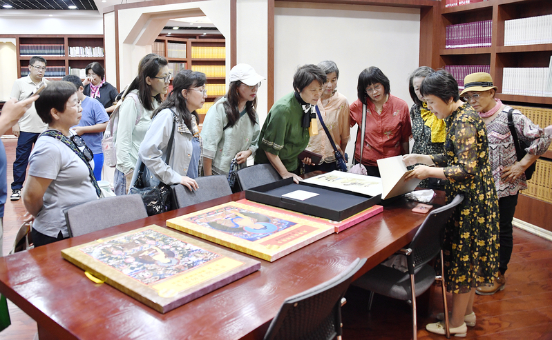 在学校敦煌文献研究中心、访问团成员认真聆听了讲解员的精心讲解,对学校馆藏敦煌各类文献资料表示出浓厚的兴趣,感叹敦煌文化的博大精深。在学校非遗知识馆,访问团成员面对剪纸、庆阳香包等各类非物质文化遗产,不停驻足询问,对学生的非遗作品惊叹不已。