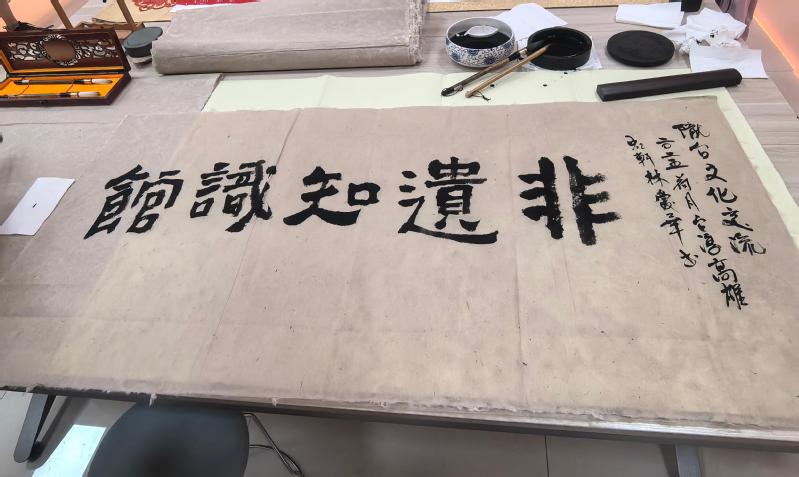 在交流阶段,台湾中华虹华艺术学院院长林爱华女士,现场为学校非遗知识馆题词,在笔墨流转间共叙文化情缘,以艺术为媒深化两岸教育交流合作。